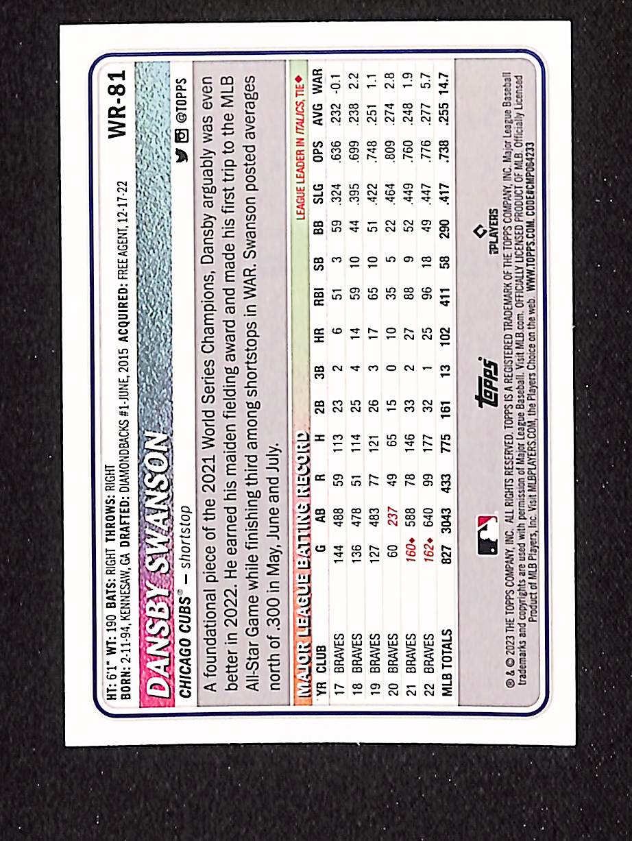 Dansby Swanson 2023 Topps Big League Baseball Green #WR-81 /99
