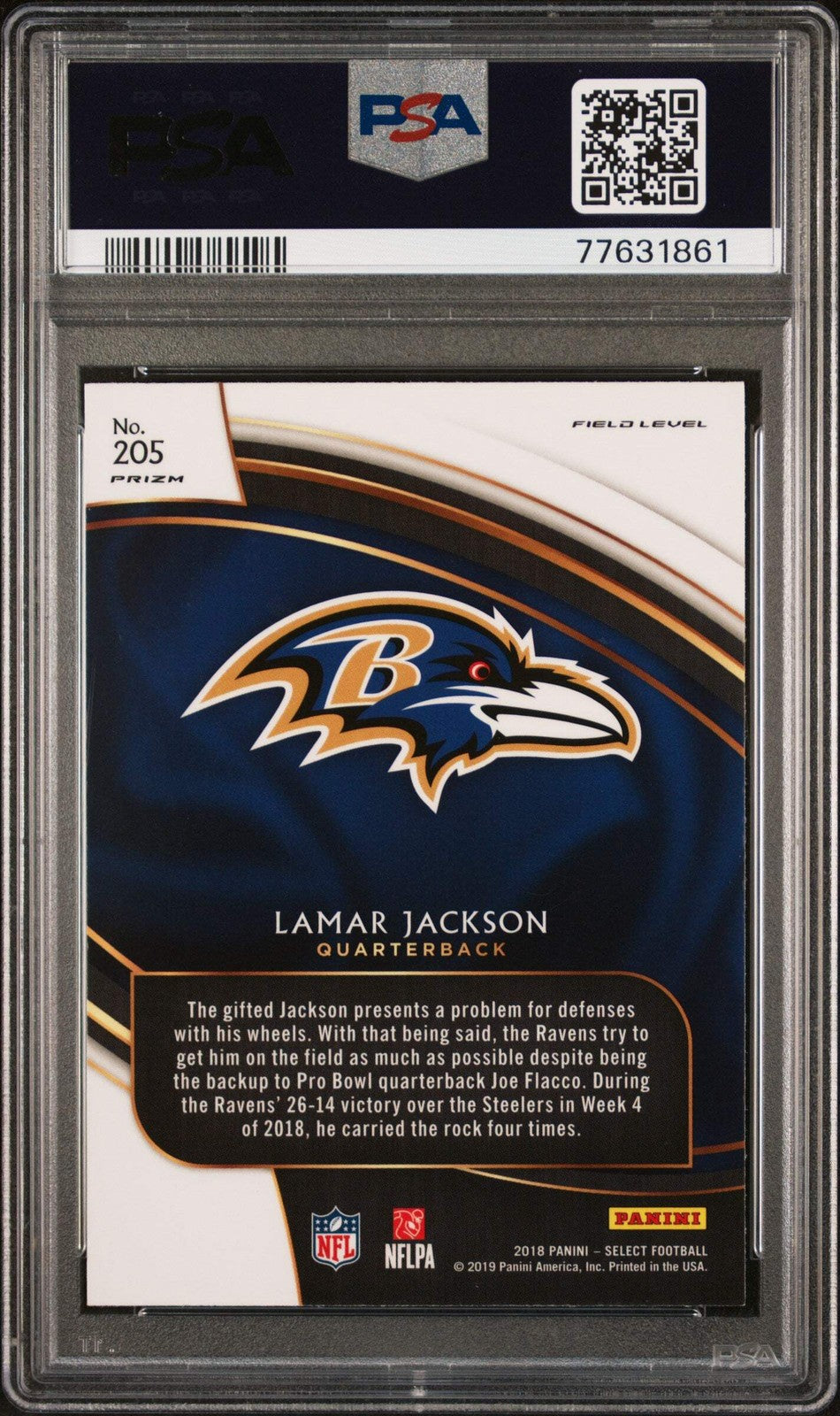 Lamar Jackson 2018 Panini Select Silver Prizm #205 PSA 10 ShippingCombined shipping is available, when applicable. If you have a particular way you would like a card to be shipped, please let us know. We will accommodate most shipping requests within reason. We ship orders out fast!!! All orders will be shipped the next day after payment, except for weekends. Delivery dates are only estimates; Please follow your tracking number for the exact delivery date.About UsThis card is authentic. We don't grade or give an opinion about the condition of the card, please carefully examine the photos of the card for the condition. The card pictured is the card you are bidding on or purchasing. The description may mistakenly be inaccurate if not caught during the listing process. ***Please note that the card pictured is the actual card you will receive, regardless of the description*** If you have any questions about the listing or need further pictures, we ask for you to please send us a message. All cards priced over $20 will be packed with care in a penny sleeve and top loader or semi-rigid and shipped in a waterproof mailer.Thank you for supporting our small business!!!Located in Minot ND, The Sports Shaq is your one stop card shop for all your sports and gaming cards, memorabilia, collectibles, and supplies! Shipping Combined shipping is available, when applicable. If you have a particular way you would like a card to be shipped, please let us know. We will accommodate most shipping requests within reason. We ship orders out fast!!! All orders will be shipped the next day after payment, except for weekends. Delivery dates are only estimates; Please follow your tracking number for the exact delivery date. About Us This card is authentic. We don't grade or give an opinion about the condition of the card, please carefully examine the photos of the card for the condition. The card pictured is the card you are bidding on or purchasing. The description may mistakenly be inaccurate if not caught during the listing process. ***Please note that the card pictured is the actual card you will receive, regardless of the description*** If you have any questions about the listing or need further pictures, we ask for you to please send us a message. All cards priced over $20 will be packed with care in a penny sleeve and top loader or semi-rigid and shipped in a waterproof mailer. Thank you for supporting our small business!!! Located in Minot ND, The Sports Shaq is your one stop card shop for all your sports and gaming cards, memorabilia, collectibles, and supplies! eBay integration by Listed With Mascot.